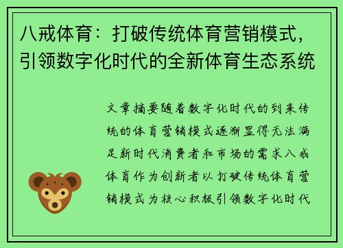 查看更多文章摘要:随着数字化时代的到来,传统的体育营销模式逐渐显得无法满足新时代消费者和市场的需求。八戒体育作为创新者,以打破传统体育营销模式为核心,积极引领数字化时代的全新体育生态系统。八戒体育不仅重视体育赛事本身的内容创作,还深入挖掘数字化工具的潜力,通过智能化分析、线上平台互动以及大数据的应用,推动体...